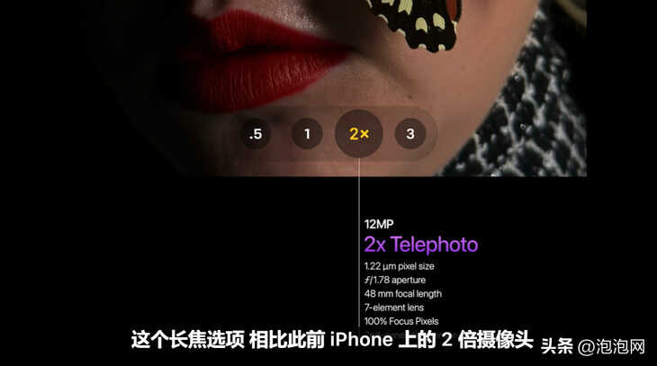 iPhone 14 Pro系列的主摄还配备有100%的Focus Pixels(像素对焦能力),配备有全新的第二代传感器位移式光学防抖,采用24mm焦距,苹果官方称,其可以进行2X的裁切,获得44mm焦距的拍摄效果。