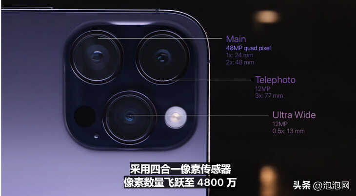 iPhone 14 Pro系列采用了全新的4800万像素主摄镜头,支持4合一为1200万像素进行拍摄。其相比较于iPhone 13 Pro的主摄提升了65%的传感器尺寸,单像素尺寸为1.22微米,光圈达F1.78。