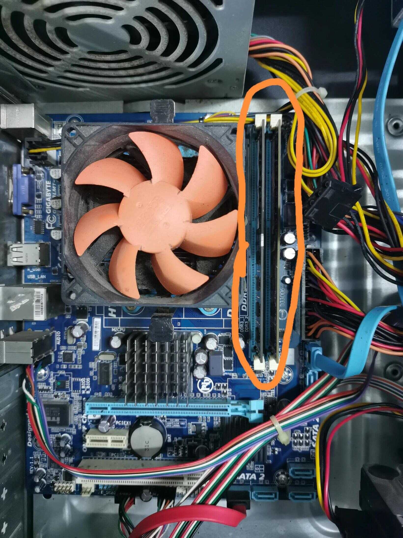 红圈里面就口内存(不同电脑位置不同但都在中间风扇的旁边),之后记下方向就是中间有个槽口,反了有可能会烧。