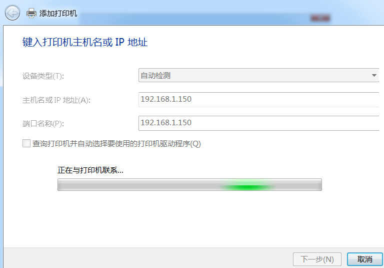 7.输入打印机的IP地址,如:192.168.1.150。如果你不知道,你可到打印机上的显示屏上去看,就显示在上面,当然有的是不显示的,你可以按“菜单”或“功能”键,按向下键找到“网络”,按“确定(OK)”键,再向下键,找到IP地址,按“确定(OK)”键。看到后记住,最后按返回键退出来。