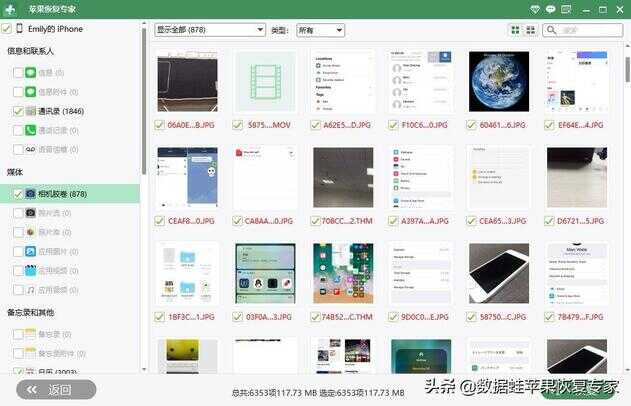 步骤二:扫描完成后,点击左侧的“相机胶卷”,页面的右边将会显示出全部数据正常的照片,红色字符的为已删除的照片,黑色字符的为正常照片,只需要选出需要恢复的照片,最后点击“恢复”即可。