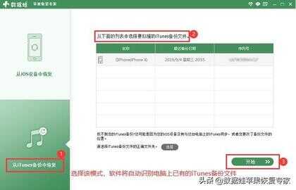打开数据蛙苹果恢复专家,选择“从iTunes备份中恢复”,在页面上可以看到,电脑上的iTunes文件包自动显示在软件上,此时,我们只需要选择一个iTunes备份文件,即可点击“开始”,解析完毕后,结果如“从iOS设备中恢复”这种模式那样,进行选择照片,选择完毕点击“恢复”就可以了。