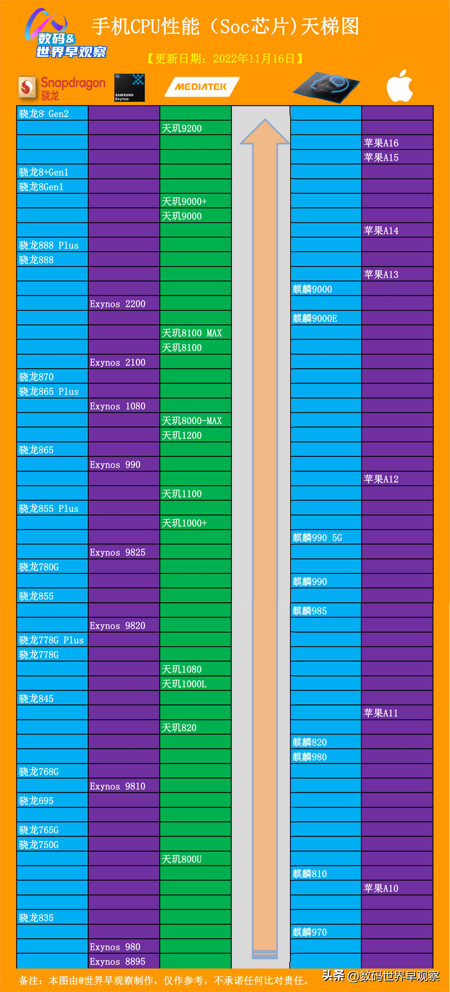 2022年11月有两款顶级旗舰新芯片发布,分别是联发科的天玑9200与高通的骁龙8 Gen 2,一举刷新了手机处理器排行榜,以下《手机cpu天梯图》为2022年11月第2版修正,长图,请点击放大查看。