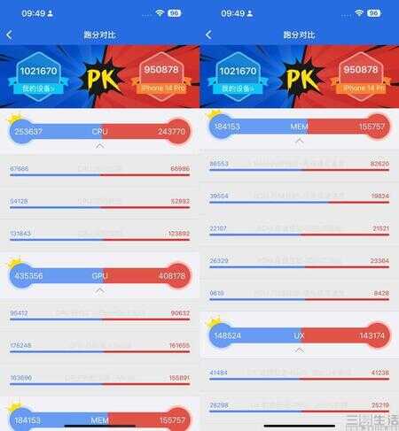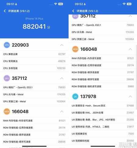 可以看到,一如前文在技术分析中所提及的那样。尽管同为A15仿生芯片,但GPU规格不同的iPhone 13 mini与iPhone 14 Plus,很明显地在CPU部分的测试成绩不相上下,但在GPU、内存,以及存储性能上则产生了较大的差异。不过从GPU成绩来看,差异并没有达到此前预计的25%这么多,而是大约10%左右。