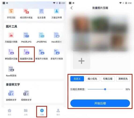 【操作方法】:打开软件,点击“工具”——“图片工具”——“批量图片压缩”,上传多张图片,接着选择压缩模式,调整图片清晰度,点击“开始压缩”按钮开始压缩即可。