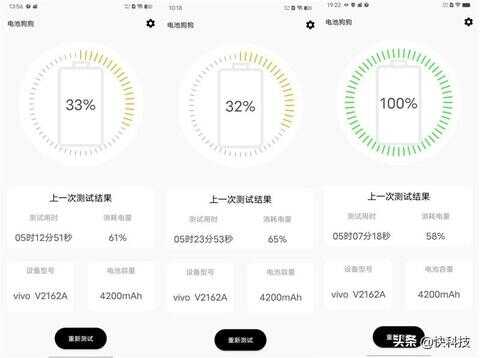 我们对vivo S12进行了三次测试,第一次测试用时5小时12分钟51秒,耗电量61%,第二次测试用时5小时23分钟53秒,耗电量65%,第三次测试用时5小时7分钟18秒,耗电量58%。