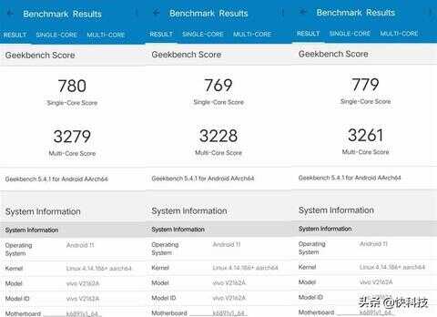 在Geekbench跑分中,为了排除单次单侧的不确定性,我们连续测试了三次,可以看到天玑1100的单核成绩稳定在780分左右,多核成绩稳定在3200分左右,这个成绩与高通骁龙865不相上下,基本就是次旗舰手机的档次。