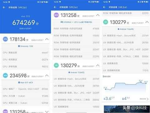 在安兔兔测试中,vivo S12的总得分为674269分,其中CPU得分为178134分,GPU得分为234598分,MEM得分为131258分,UX得分为130279分,测试期间手机温度上涨了3.6℃。