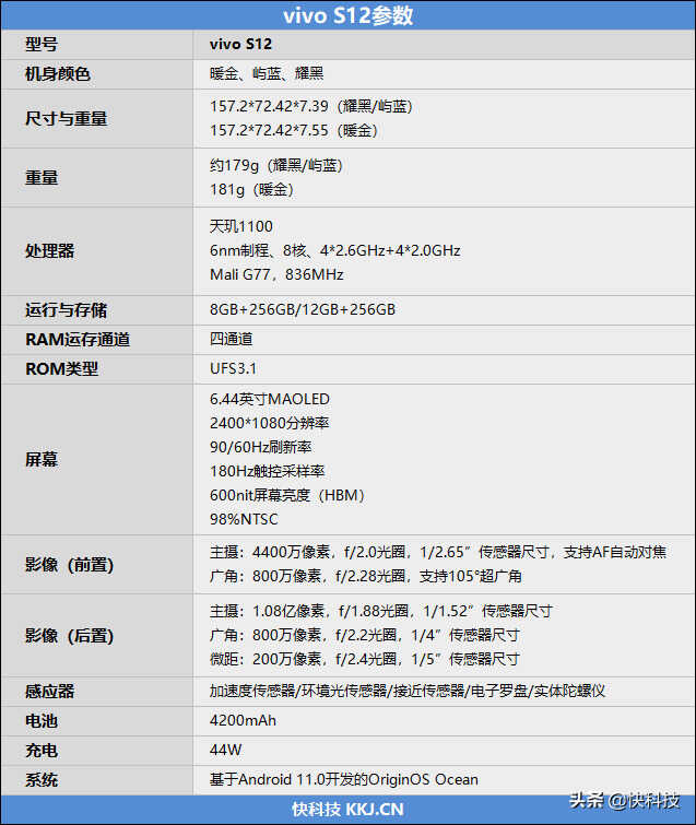 此外vivo S12的电池容量为4200mAh,支持44W闪充,以下是vivo S12的详细参数。