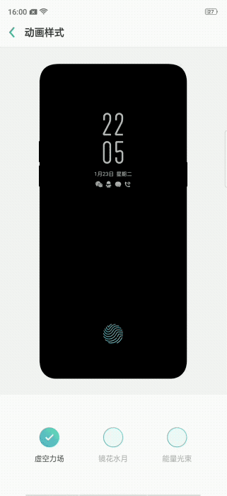 OPPO R15X加入了光感屏幕指纹,屏幕解锁自然也是系统体验的一个亮点。在屏幕解锁动画上,OPPO R15X提供了三种动画样式选择,无论飘渺的虚空立场,自然的镜花水月,还是闪耀的能量光束,你总能选到最适合你自己的一款。