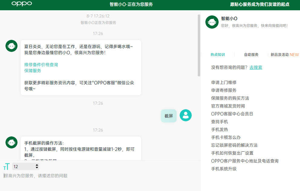 此外,OPPO还通过简化入口操作、优化服务流程等方法减少用户时间及精力成本,全面提升服务质量及效率。更有智能化服务全面覆盖线上渠道,小欧智能客服7*24小时在线,可实时解决大部分用户的问题解答需求。例如,在OPPO官网,找到在线咨询入口,在对话框输入“截屏”,就能立刻收到小欧智能客服提供的操作方法的详细教程。相信有了智能化服务和贴心人工服务的加持互补,解决用机问题,不再会是OPPO用户的难点。