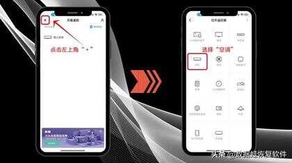 步骤2.在首页我们点一下左上角的“+”,根据实际需求添加想要操控的设备,不过我们响应本文主题,这里选择“空调”;