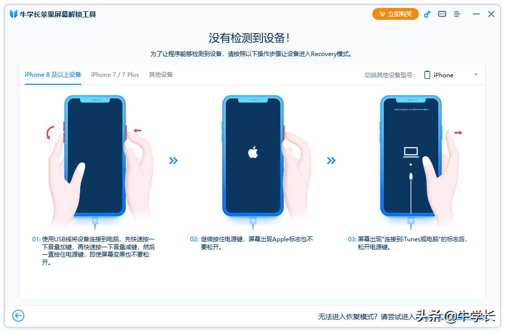 此方法适用未设置“查找我的iPhone”功能的用户,通过手动将设备进入恢复模式/DFU模式,再进行“恢复”操作,注意会彻底清除设备数据!