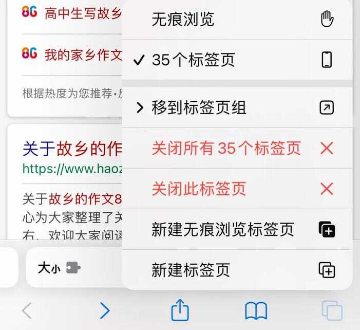 当你正在秘密浏览某些资料时,有人借用你的手机,此时只要长按住右下角的标签页,就能迅速关闭所有页面。