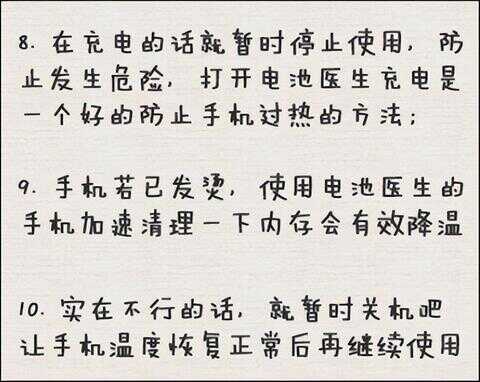 小编提醒:这时最好不要使用手机打电话、玩游戏、看视频,这样会导致电压不稳从而产生更多的热量,长久下去也会损耗电池的寿命,在某些状态下这种行为还会增加电池爆炸的几率。