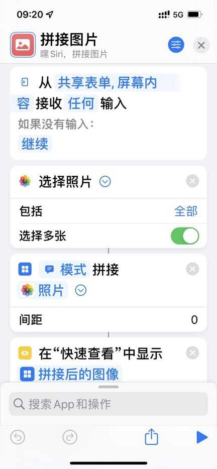 第1步是为了方便你在相册中选中多张图片后,以共享方式分享至此快捷指令,不需要的可以去掉,直接从第2步开始;第4步是显示拼接后的图片,方便分享给他人;至于2、3两步,大家都懂,先选择照片,然后按照“模式”拼接照片,至于模式都有哪些,运行一下快捷指令就知道了。其中,第3步的“间距”指的是图片拼接时,图片之间留白的距离,可以按照个人喜好调整。