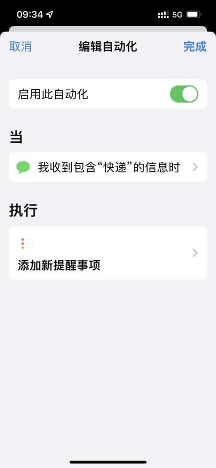 这也是一个自动化模式。随着网购增多,有时我们自己会忘记取快递,这个自动化的作用是:当收到含有“快递”这两个字的短信时,自动设置提醒事项提醒我们取快递。