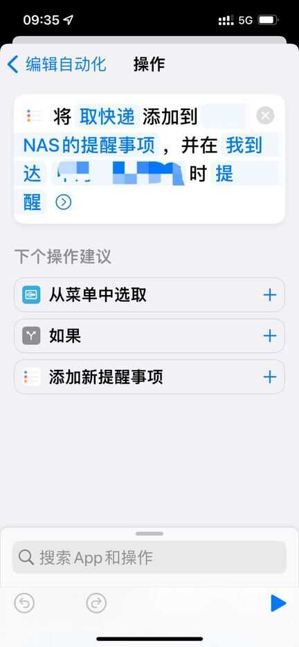 我一般都把快递邮到家,但因为回家的时间不固定,所以我把提醒事项设置成到家后提醒。图片中的蓝色字体都是我们可以编辑的地方,改变它们来创造更符合你生活习惯的自动化吧!