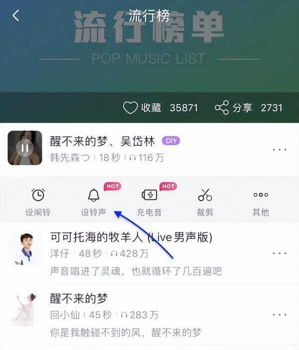 2. 打开酷狗铃声App,选择任意一首自己喜欢的歌曲,点击【设铃声】。