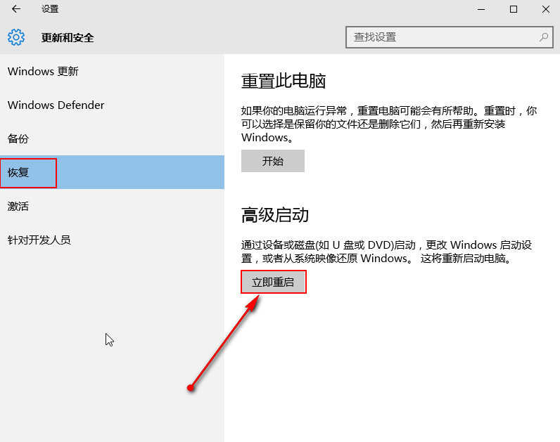 3、点击“恢复”选项,选择“立即重启”,如下图所示:
