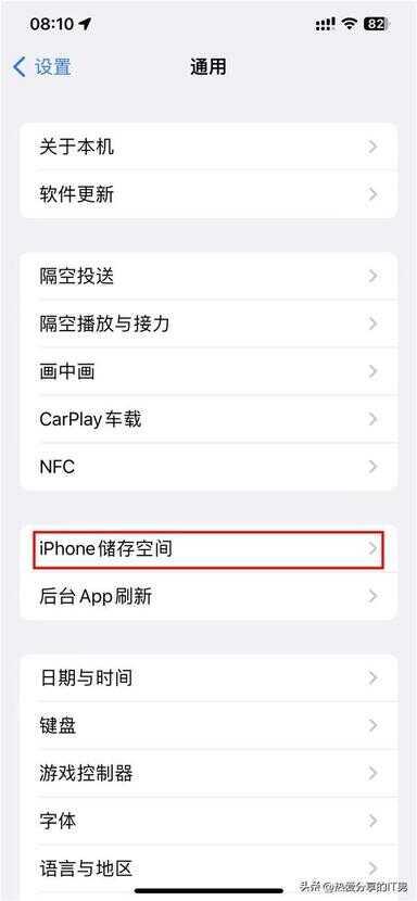 2、在“通用”设置屏幕,轻点“iPhone储存空间”。
