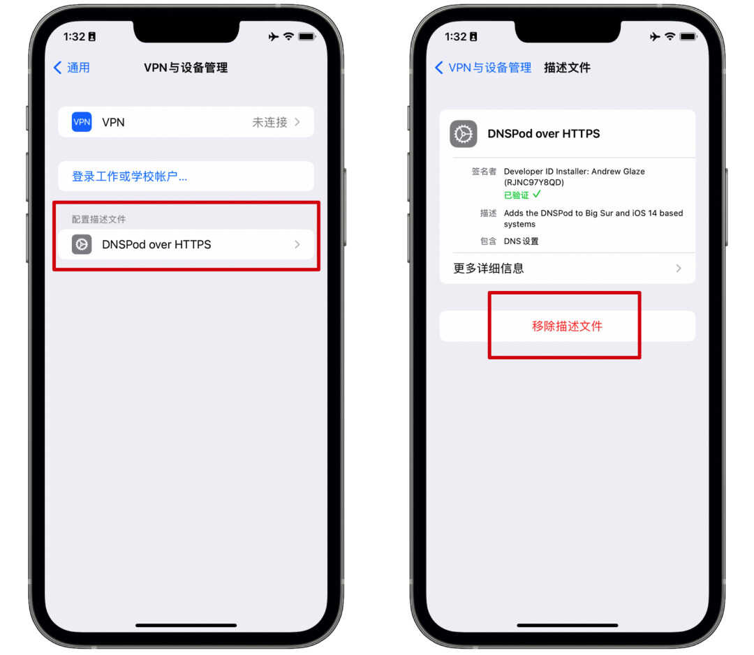 进入设置-通用-设备管理-找到前面安装的名为“DNSPod over”的描述文件,进行删除,然后重启iPhone就可以了,删除描述文件不会删除微信资料,可以放心使用。