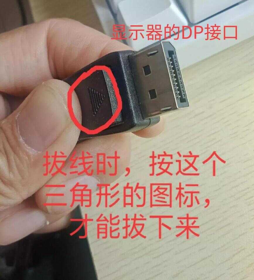 电脑连显示器的DP线拔下来时,得按着DP线上,带三角形图标的塑料片,才能拔下来。