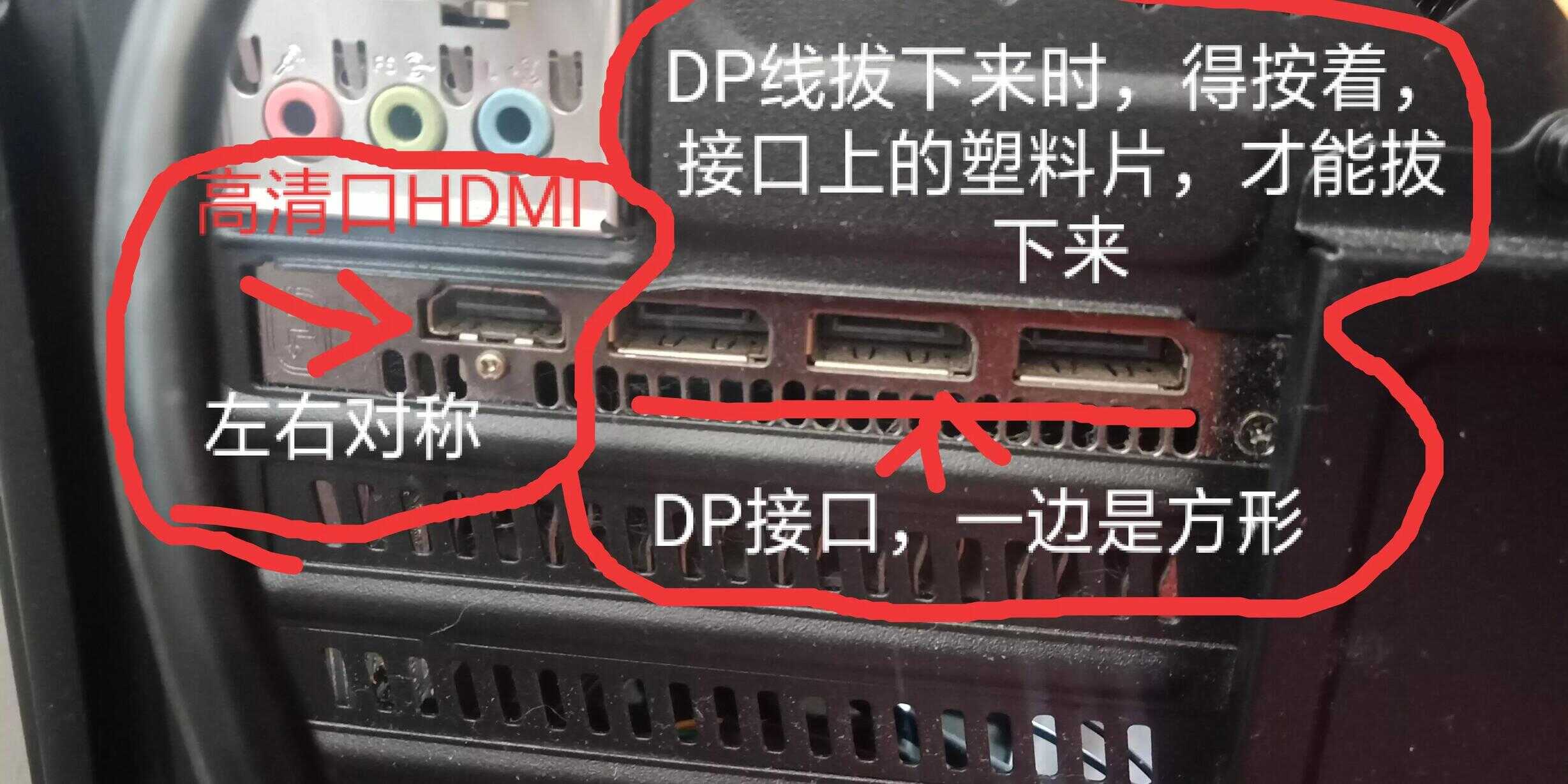 台式机电脑上的显卡,高清接口和dp接口的区别,dp线拔下来时,需按着dp线头上,带三角形的塑料片才能拔下来