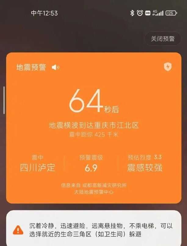 有不少媒体报道,地震发生前,四川、重庆居民发了自己手机中的地震预警,其中一名重庆网友预警截图显示,“64秒后地震横波到达重庆市江北区,震中四川泸定,预警震级6.9级,震感较强。”