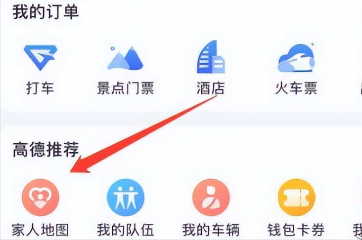 3.登录后,在高德地图右下方找到【我的】,在新弹出的页面中,有个【高德推荐】栏目,在这个栏目下面,我们用手指往左边滑动,就会看到一个【家人地图】,找到【家人地图】后,我们点进去;
