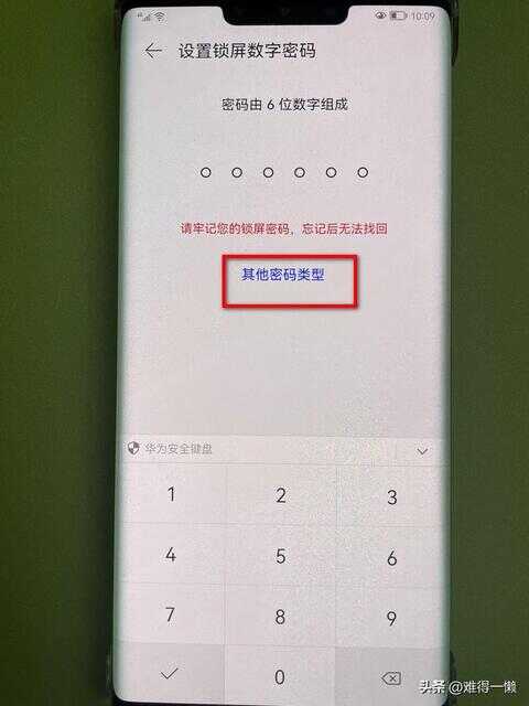 选择锁屏密码后就进入到设置界面,默认的是设置6位数,习惯使用的话,直接设置6位数密码就可以。如果不喜欢,可以选择其他密码类型。