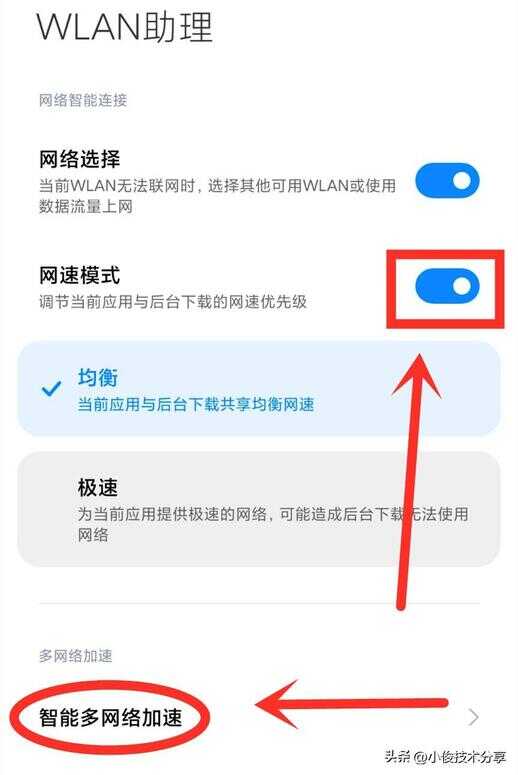 在设置界面中,我们点击【WLAN助理】,在【WLAN助理】中我们把【网速模式】开关打开,打开之后手机就会智能调节网络连接模式,从而让我们体验更好的网络效果!