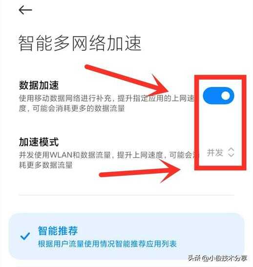 除此之外,我们还可以点击下方的【智能多网络加速】开关,把【智能多网络加速】中的【数据模式】和【加速模式】这2个开关也打开,打开之后不仅可以提升手机网速,而且还能对指定应用进行提速,比如说我们经常看新闻资讯,看视频,那么我们就可以单独对这些应用进行加速,从而就不会出现网速慢,无法联网的情况了!