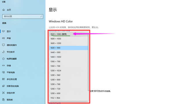 (5)点击【显示分辨率】下面的方框后,在弹出的下拉菜单中 选择要设置的分辨率 然后单击。