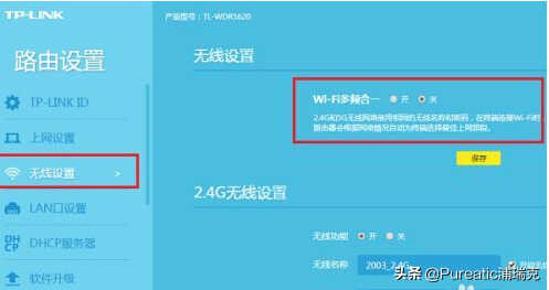 第三步进去路由设置之后,点击无线设置,将wifi多频合一关闭掉,这个主要是将2.4G和5G合并,保留高频率的5G,如下图所示: