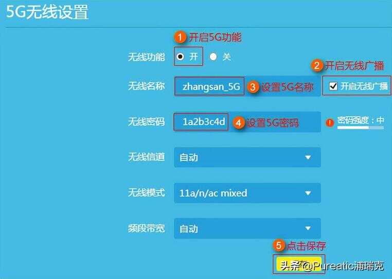 第五步设置5G的无线网络,输入名称和密码,进行保存,这样就会有两个wifi,根据需要连接,像天猫精灵目前只支持2.4G的,如下图所示: