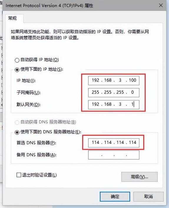 ④如果【选择使用下面的IP地址】,则需要手动输入IP地址,前提是需要知道具体的IP地址,在遇到QQ能上但网页打不开时,上面一栏可以选择【自动获得IP地址】,下面一栏选择【使用下面的DNS服务器地址】,并输入114.114.114.114(全国通用),设置完成后点击确定(注意:点击【确定】后,回到上一层界面还需要再点一次【确定】,否则更改不生效)。