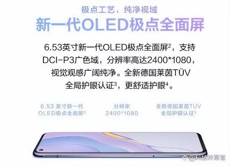 华为nova 7采用6.53英寸新一代OLED极点全面屏,支持DCI-P3广色域,分辨率2400*1080。拥有全新德国莱茵TV全局护眼认证。这说明华为nova 7在对视力的保护上也狠下苦功,不仅仅保证了画质的清晰,还能减少电子屏幕对眼睛的伤害。