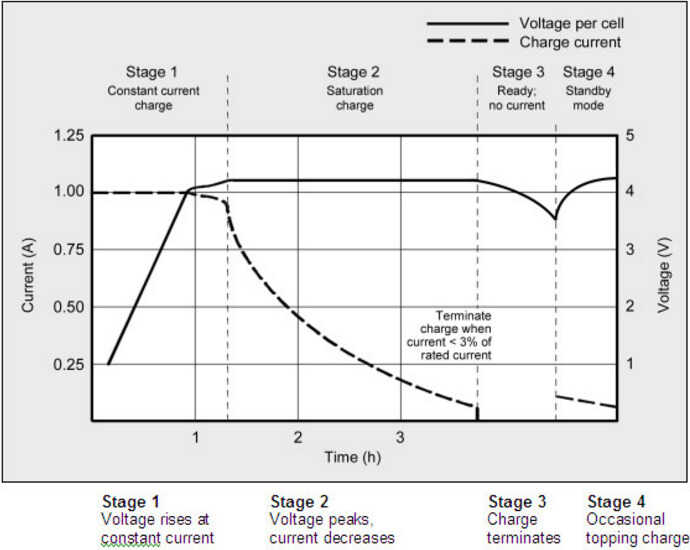 电池充电完成时,电流达到最小值,电压仍保持最高值,这时候充电效率最低。一旦过了这个临界点,电压便开始慢慢降低,并降低到一个较低值;