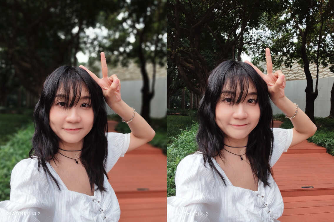 小米Civi 2 的虚化效果是怎么实现的呢?答案是两颗摄像头同时工作,原理与我们的双眼测距相同,两颗摄像头同时拍摄,通过算法将两张图片结合并得到真实的深度信息,从而根据信息进行虚化操作。我们也实测了一下在人像模式中用手遮挡住超广角镜头,虚化效果两者差距确实非常明显。