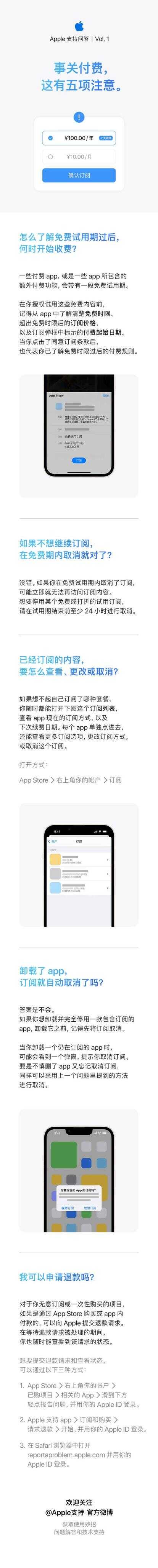 如果你也有App订阅类的困惑,不妨看看苹果官方提供的一份解决方案。1月4日中午,Apple支持官方发布了一张长图,里面详细地解释了有关于付费订阅的五项注意事项。