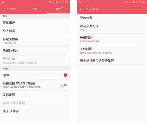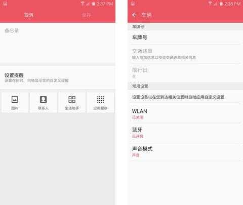 在更新到3.2版本后,S助手的界面明显发生了巨大变化,增加了明显的生活助手标签在第一个界面,而此前的提醒功能则可在顶部标签切换,个人信息也作为单独的标签存在,可设置首选交通方式,睡眠时间及工作时间等等,系统将会根据这些信息来推荐上下班路线及闹钟、免打扰模式等等。同时,S助手还新增了设置车牌号和限行日等个性化信息及自定义提醒,这比竞争对手的同类软件要强上不少。