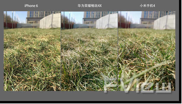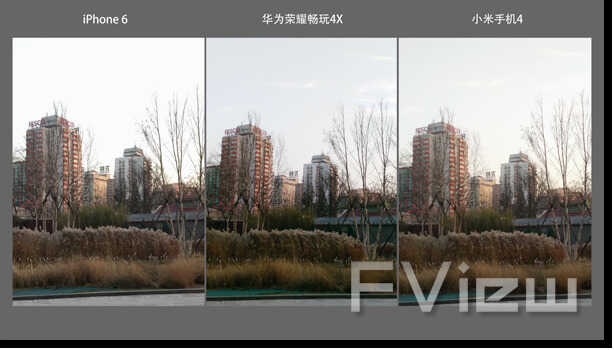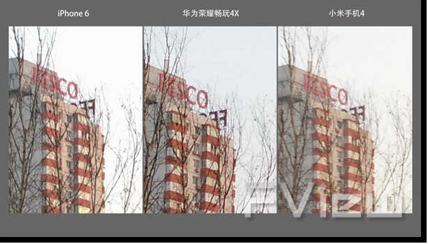在解析力方面,1300万像素的畅玩4X和800万的iPhone6处于同一水准,但畅玩4X出现了明显的锐化痕迹,虽然能讨好眼球,但也会对照片的细节造成一损失,而同为1300万像素部分的小米4却意外地落于下风。另外,在同一对焦点的情况下,畅玩4X和小米4都保留住了天空的部分细节,而iPhone6却始终过曝。