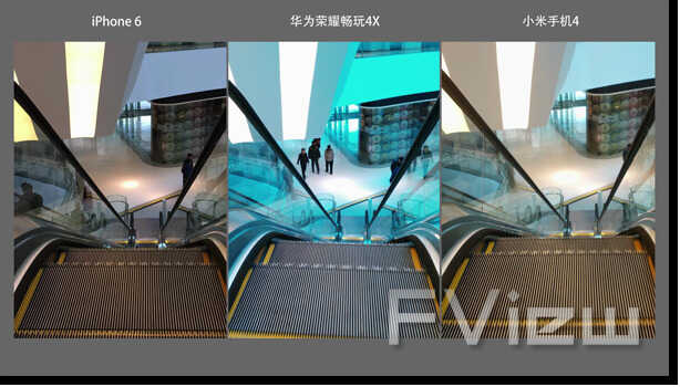 在室内拍摄的样张中,由于现场的光线环境相对复杂,畅玩4X和小米4都出现了白平衡漂移的情况,尤其是畅玩4X表现得尤为严重,几乎就和自带滤镜一样。而iPhone6画面整体略微欠曝,但白平衡依然是最为准确的。