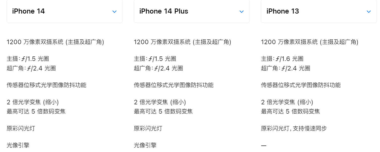 所有参数看下来,iPhone 14变化最大的是影像系统,全新的光像引擎和F/1.5光圈(iPhone 13为F/1.6),为iPhone 14带来了更好的夜间拍摄体验。