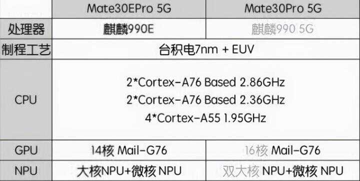华为mate30E作为2020年末刚上市的手机,其处理器是麒麟990e作者查了一下,990e 5G处理器在GPU方面不如mate30麒麟990 5G处理器,在CPU配置和时钟速度、NPU方面是相同的,它也有麒麟990 5G处理器所没有的,它配备了5G调制解调器,并对5G调制解调器进行了升级,用以支持更多网络频率,这点麒麟990 5G处理器不如它。