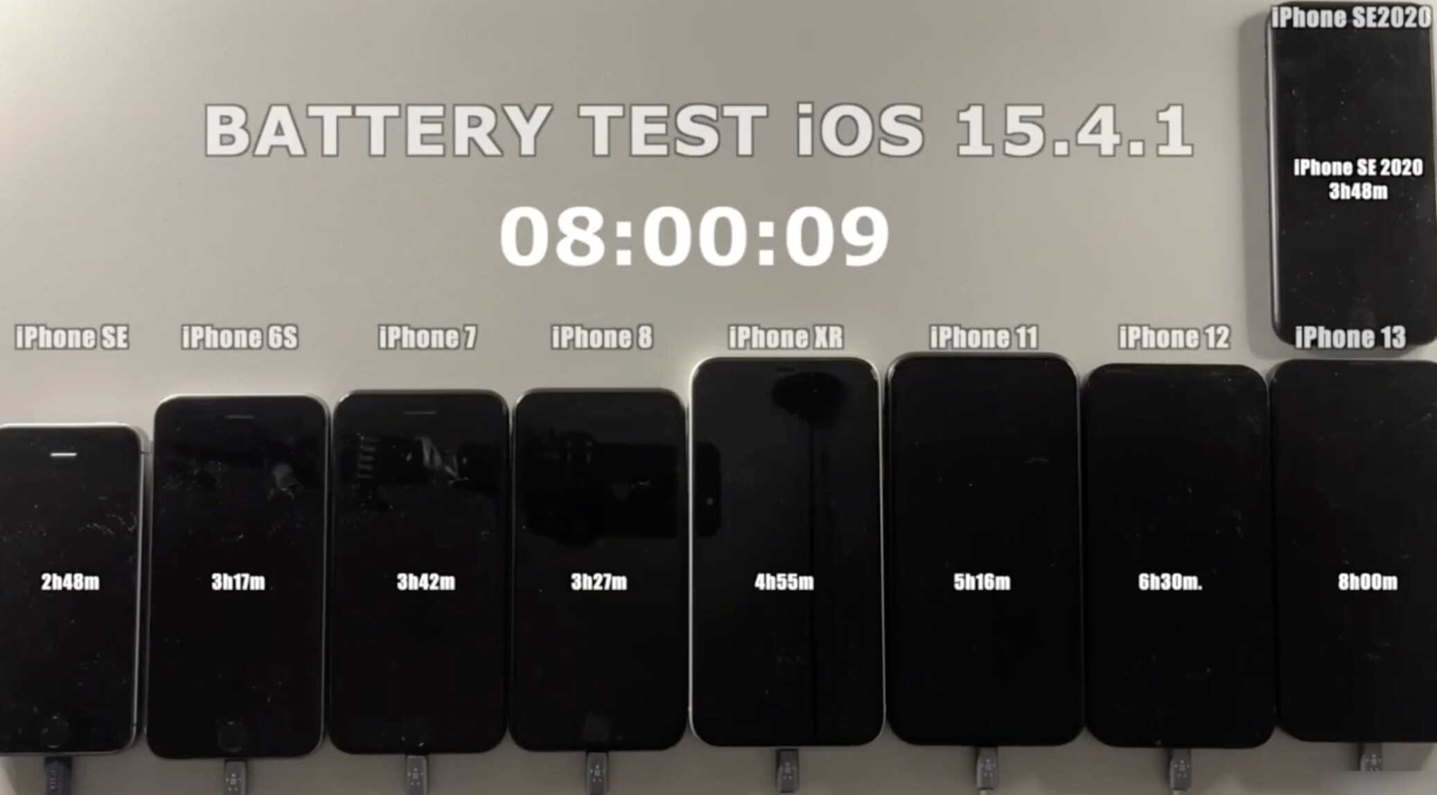 接下里将所有手机更新到了最新的iOS15.5系统,我们再来看一下这9款iPhone的表现吧,对比两次实验的结果来看,大部分苹果手机的续航时间变长了,不过幅度不大,其中iPhone13续航时间多了28分钟,甚至一些老款机型,比如iPhone8/iPhone XR也有轻微的提升。