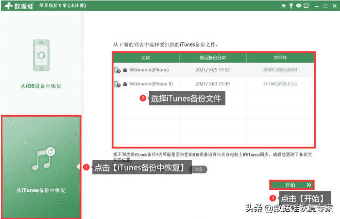 点击第二种模式“从iTunes备份中恢复”,在右边的信息框中就会显示您在电脑上的iTunes备份文件,从中选择需要恢复的备份文件夹,点击“开始”,等待扫描结束,接下来的操作步骤跟方法二一样。