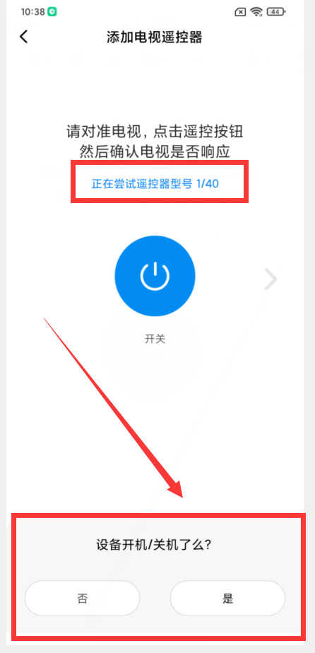 把手机顶部对准电视机(一定要对准哦),然后点击上图的“开关”按钮,这时在屏幕底部会显示“是”与“否”。