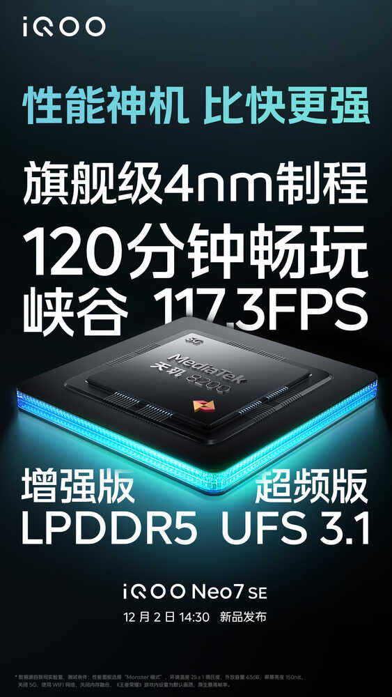 跑分方面,此前爆料称天玑8200的安兔兔总成绩超过了90万分,比对手高通骁龙888更胜一筹,后者安兔兔成绩在80-85万分之间。另外iQOO Neo7 SE还配备了增强版LPDDR5和超频版UFS 3.1,官方称能够以117.3FPS的高帧率畅玩《王者荣耀》足足120分钟,这个表现已经比许多旗舰手机还要强了,果然iQOO即使是Neo、SE也还是有着游戏基因。